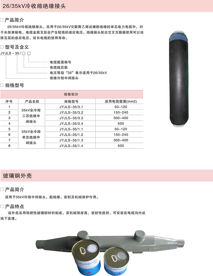 26/35kV冷縮電纜絕緣頭,應用于26/35kV交聯聚乙烯或橡膠絕緣的單芯電力電纜中,對于長距離輸電,電纜金屬互層會產生較高的感應電壓,絕緣接頭配合交叉互聯箱使用可以消除互層的感應電壓,延長電纜的使用壽命。